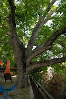 Tras pasar el arco divisas el entorno del parque, dominado por dos nogales centenarios. Bajas por unas escaleras metálicas.